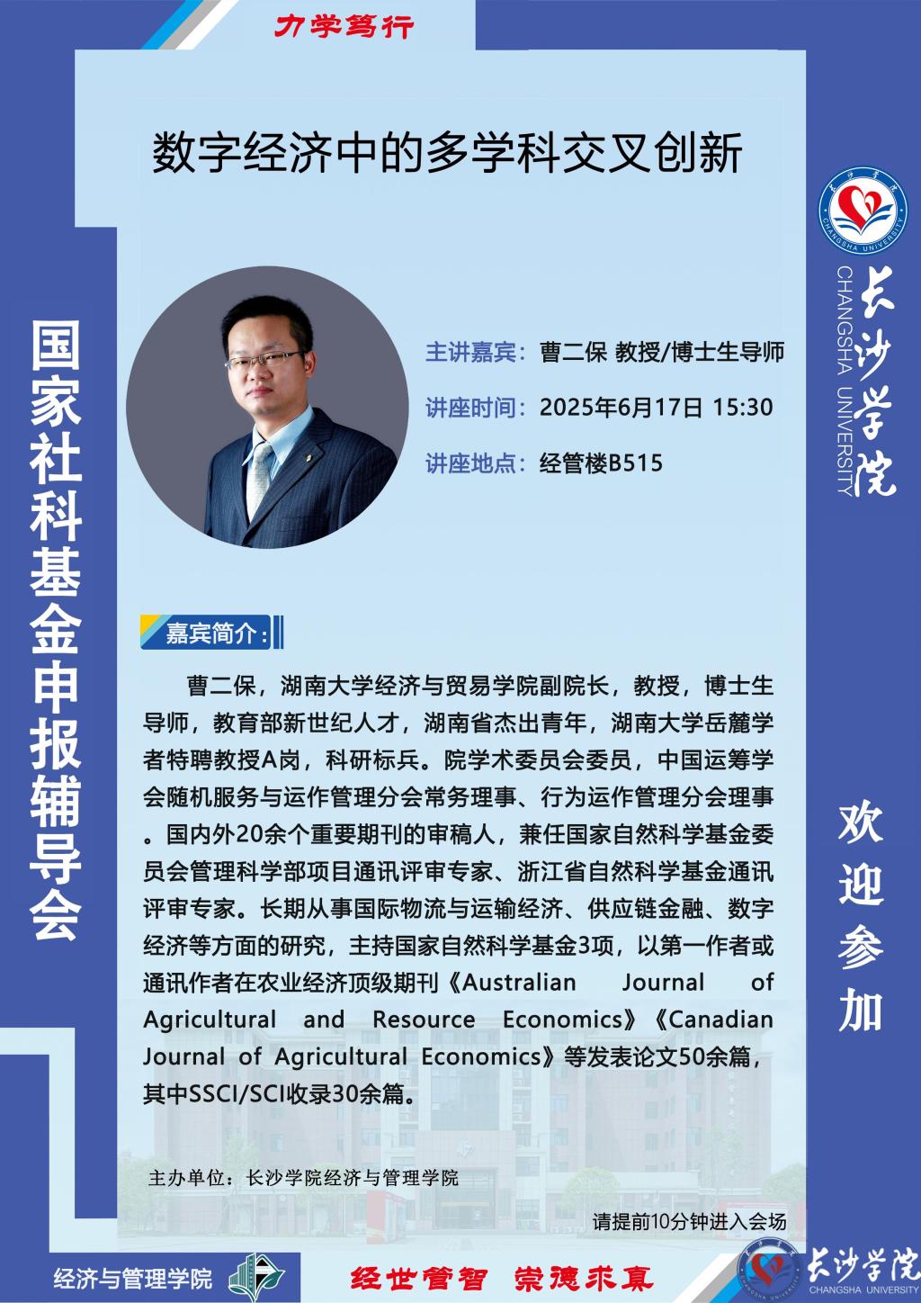 曹二保,湖南大学经济与贸易学院副院长,教授,博士生导师,教育部新世纪人才,湖南省杰出青年,湖南大学岳麓学者特聘教授A岗,科研标兵。中国运筹学会随机服务与运作管理分会常务理事、行为运作管理分会理事。国内外20余个重要期刊的审稿人,兼任国家自然科学基金委员会管理科学部项目通讯评审专家、浙江省自然科学基金通讯评审专家。长期从事国际物流与运输经济、供应链金融、数字经济等方面的研究,主持国家自然科学基金3项,以第一作者或通讯作者在农业经济顶级期刊《Australian Journal of Agricultural and Resource Economics》《Canadian Journal of Agricultural Economics》等发表论文50余篇,其中SSCI/SCI收录30余篇。