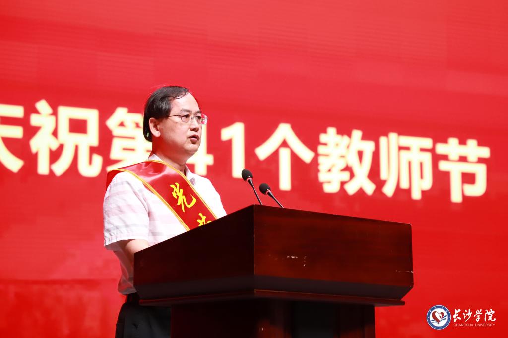 荣休教师代表、计算机科学与工程学院何文德在发言中回顾了自己二十一年的从教岁月,分享了为教学付出、见证学生成长的温暖点滴。他寄语年轻教师深耕科研和教学,关注个体差异与潜能,坚守初心,砥砺前行,成为新时代的“大先生”,并表示将一如既往地关注长大发展,为学校的每一个进步喝彩。