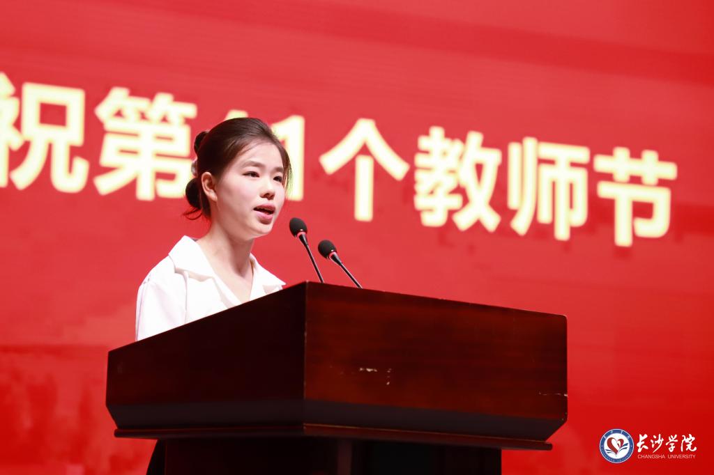 数学学院杨佳作为学生代表,向全体教师致以节日祝福与崇高敬意。她回顾了大学期间初遇学业挑战,是学院老师以专业指导助其克服困难;备战数学建模竞赛期间,也深受指导老师学术赤诚感染,历经老师多日指导陪伴,团队才成功攻关。她呼吁同学们以茁壮成长的姿态,以铿锵有力的行动,成为长大教师教育理想中最动人的续章。