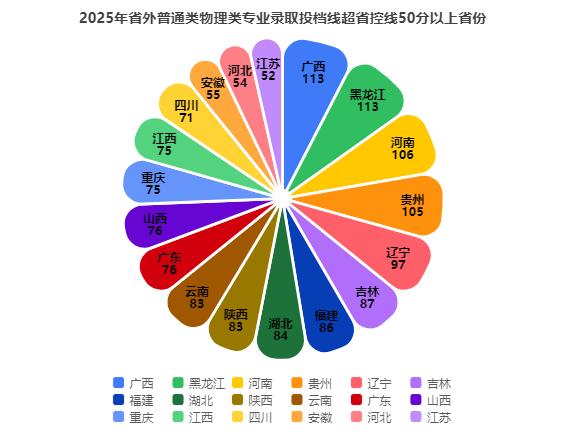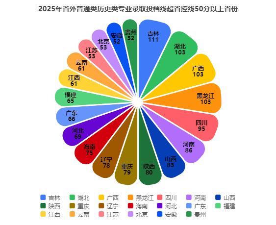 省外招生情况方面,中欧体育·(ZO SPORTS)官方网站在70%以上的外省(市、自治区)投档分高出所在批次省控线50分以上,其中吉林、湖北、广西及黑龙江历史类,广西、黑龙江、河南及贵州物理类投档分均超出所在省份投档分100分。外省录取投档分超省控线50分以上的具体情况如图3和图4所示。
