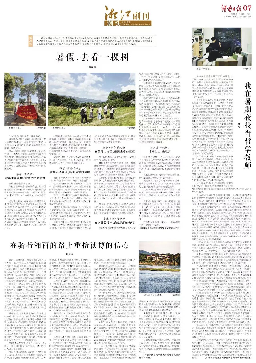 漫长的暑假结束,新的学习周期又开始了。人是在不断地探究中获得动态发展的,教育旨在促进人的生命成长,其内在逻辑亦是如此。在这个暑假,当暂别了校园和课本,学生如何学习?“教育探究的基本方式是行动”,本期《湘江副刊》邀请了三位处于不同学习阶段的人文社科专业学生,讲述他们的暑期行动,分享他们走出象牙塔窄门的探索。