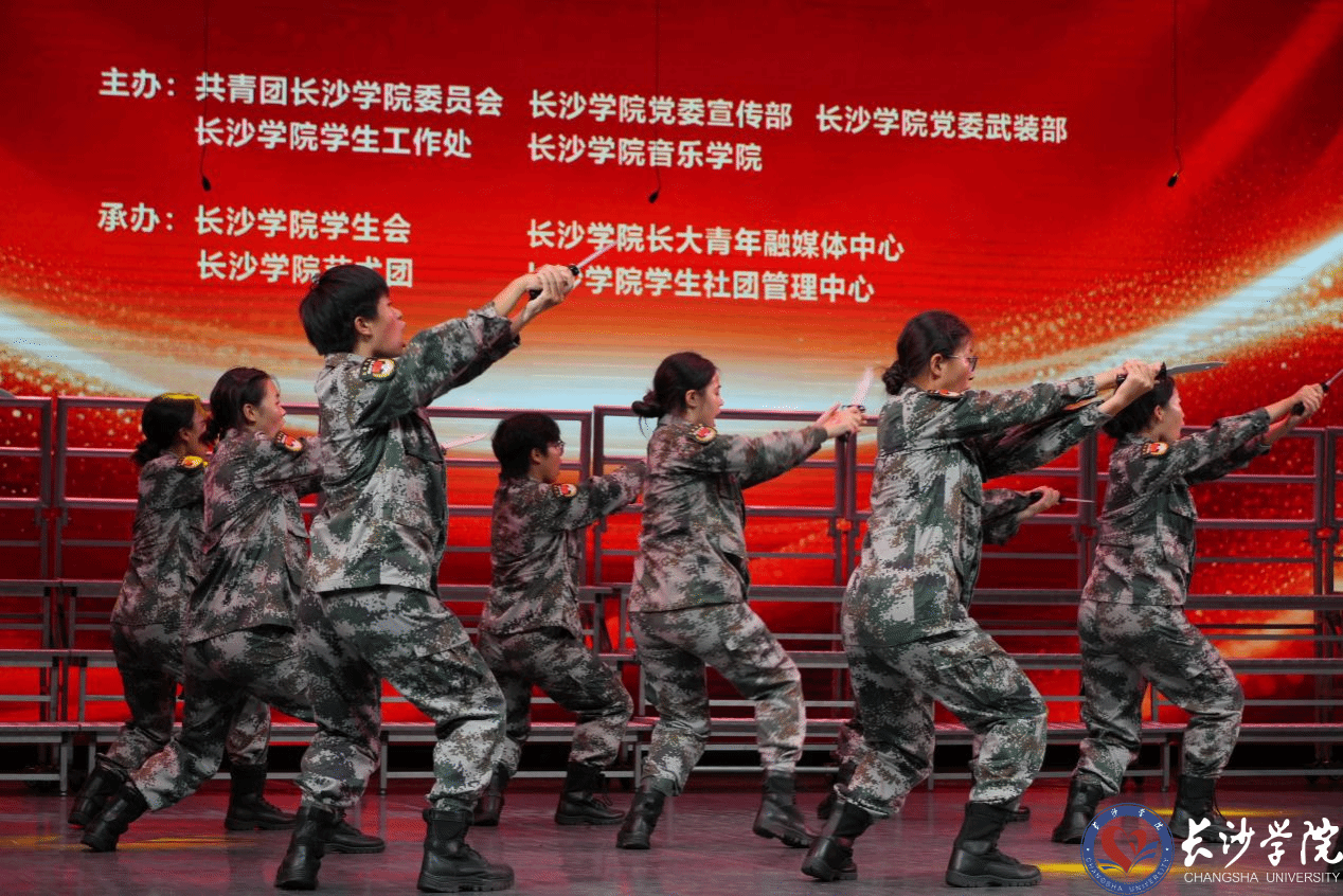 由军训教官团带来的《迷彩青春,逐梦军魂》率先出场,瞬间点燃全场氛围。机电工程学院九营四连以热血为弦,以匠心为弓,奏响《中国军魂》的铿锵旋律;马栏山新媒体学院四营七连用情景剧的创新方式,借两代人跨越时空的隔空对话,生动演绎民族复兴的时代接力;土木与工程学院八营六连的同学们于激昂歌声中穿插利落的刀术剑术展演,用青春锋芒抒写建设祖国的铮铮誓言。现场观众边听边唱,氛围温暖又有力。